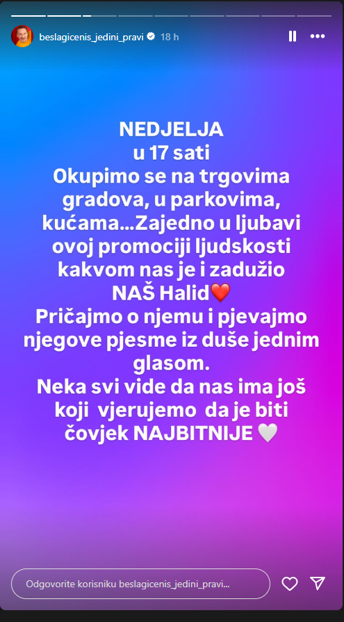 – Evo, možda se okupimo u nedjelju, u pet sati, svako u svom gradu – ne samo Sarajevo, i Banja Luka, i Mostar, i Tuzla, i Zvornik... Gospodine, još jednom si pokazao kolika si veličina čovjeka. Želim sve da pozovem da dođete da odamo počast velikom, najvećem Halidu Bešliću – rekao je Bešlagić u videu koji se širi poput požara internetom, izazivajući lavinu emocija i komentara ljudi iz cijelog svijeta.